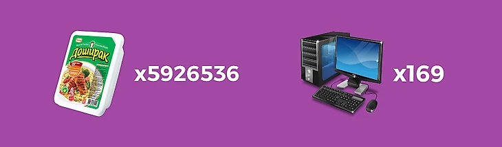 Начнем с действительно важных вещей – питание. Доширак – наш выбор по очевидным причинам. Готовится быстро, пахнет чудесно, на вкус пойдет. Наилучшее предложение я нашел с ценой в районе 43 рублей. Что же, если мы ударимся в крайности и решим обеспечить себя… а также всех своих друзей и друзей друзей пожизненно дошиками, то сможем взять аж 5926536 штук! Так можно было бы и небольшую страну прокормить.
