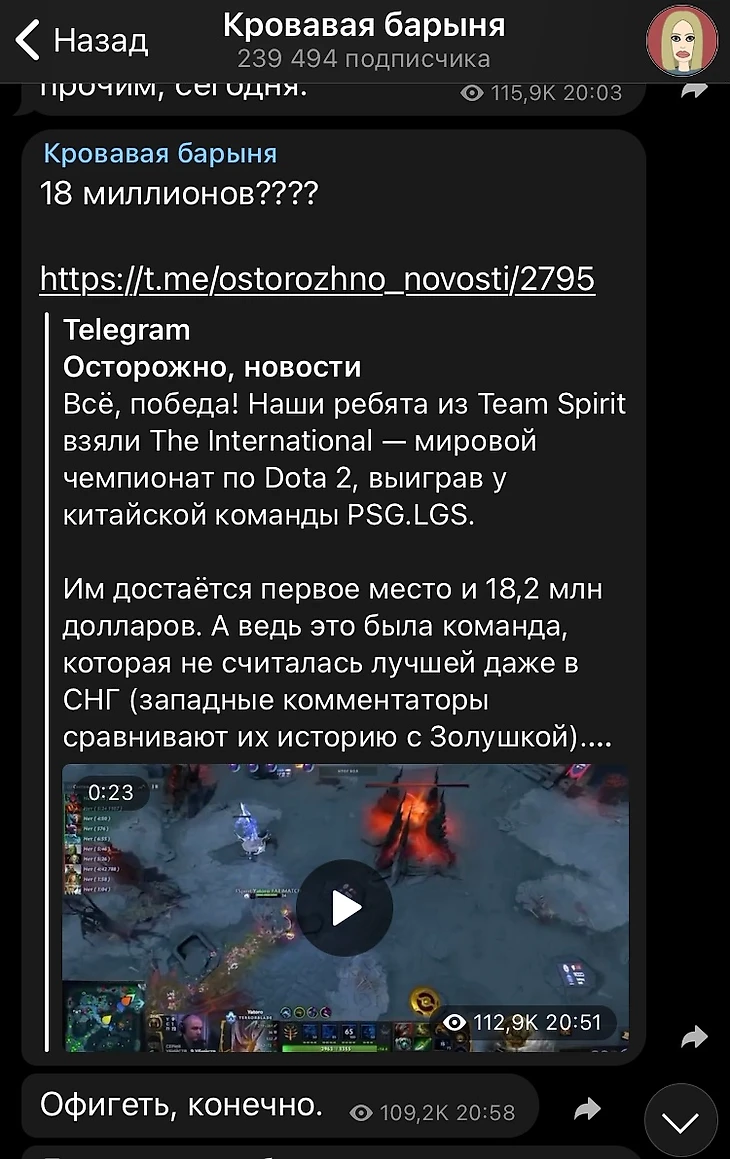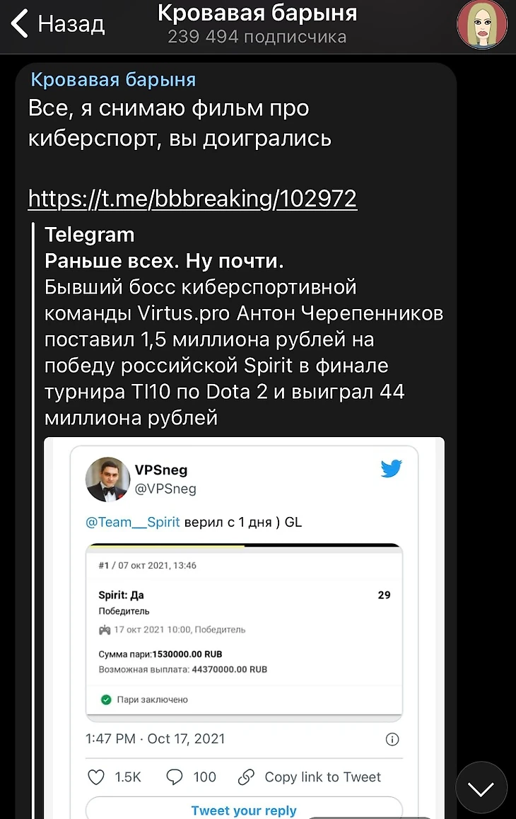 Одной из первых отреагировала телеведущая, блогер и журналист Ксения Собчак. В её Telegram-канале сначала появилась новость о победе с комментарием «18 миллионов????». Чуть позже появилась публикация со скриншотом ставки бывшего владельца Virtus.pro Антона Sneg Черепенникова. Напомню, он поставил чуть больше 1.5 миллиона рублей на победу Spirit. «Все, я снимаю фильм про киберспорт, вы доигрались», - прокомментировала пост Ксения Анатольевна.