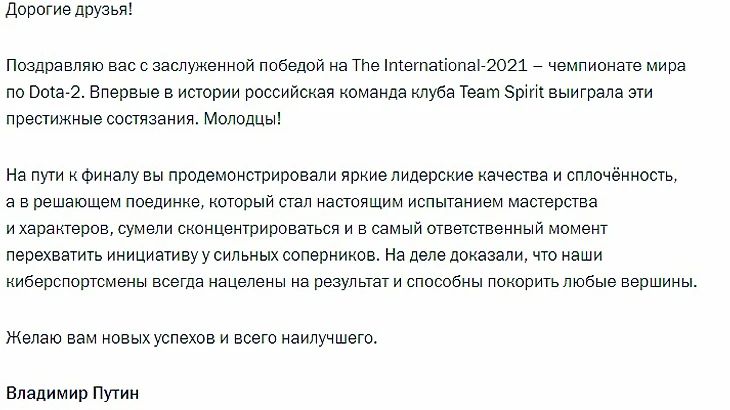 Понятное дело, что спичрайтер Владимира Владимировича с малой долей вероятности увлекается киберспортом, отсюда и моменты вроде «наши киберспортсмены». Но поздравление президента – это, конечно, в любом случае уровень.
