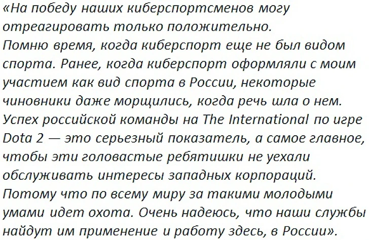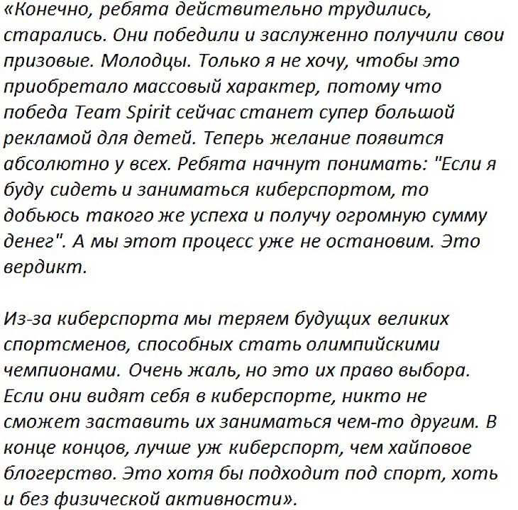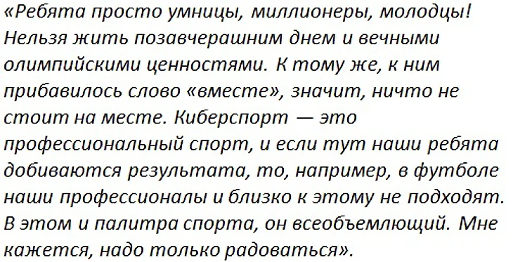 Я искренне не понимаю, почему высокопоставленные лица всё еще ищут подвох в самом киберспорте, мол ЭТО ЖЕ МОГЛИ БЫТЬ ЛЮДИ,А ОНИ СТАЛИ КИБЕРСПОРТСМЕНАМИ. Что ж, очередное упоминание денег хотя бы объясняет, почему человек решил высказать ныне непопулярное мнение.