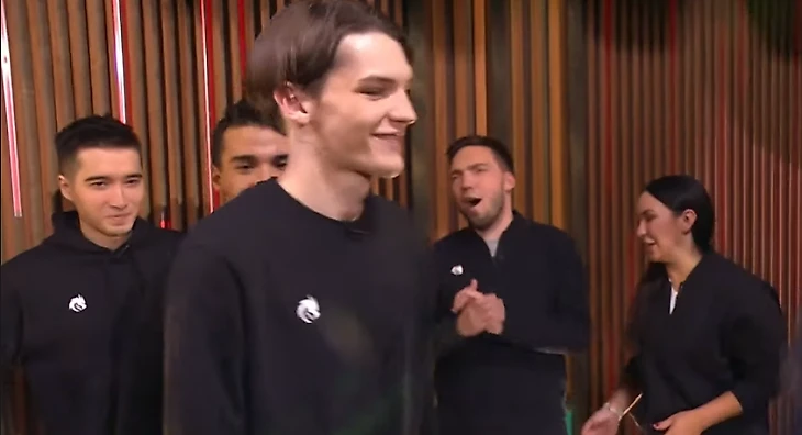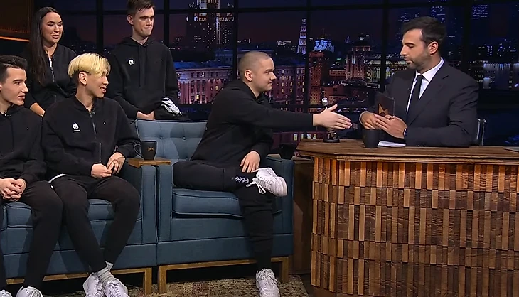 После блока с Ксенией, но до рекламы началось представление Team Spirit – Александр Гудков представил гостей программы как чемпионов The International 9.