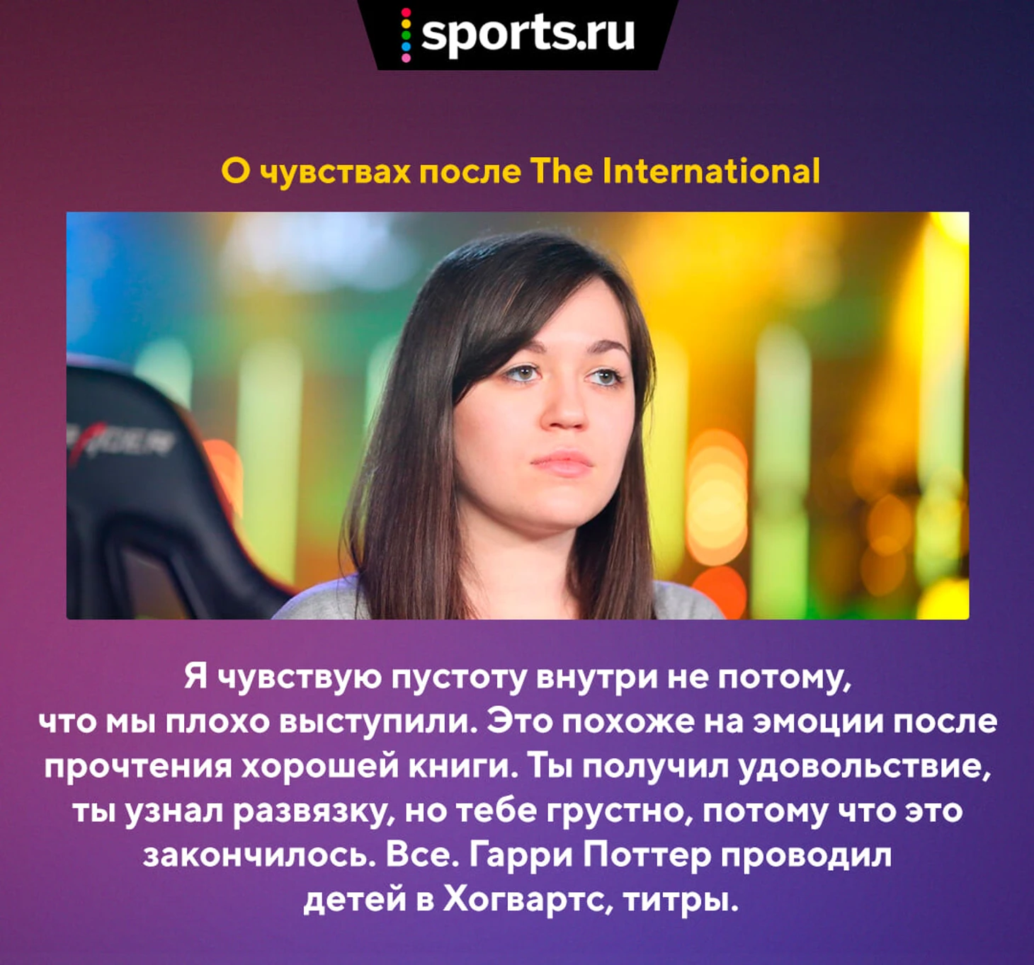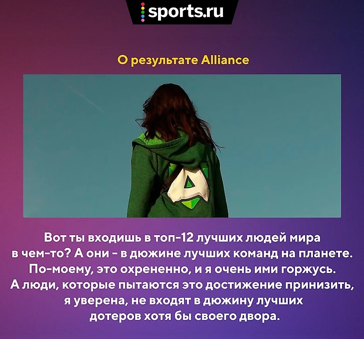 Вот ты входишь в топ-12 лучших людей мира в чем-то? Я не уверена, что вхожу. В моем роде деятельности нет универсального мерила. А у игроков в доту оно есть. И в соответствии с этим мерилом они в дюжине лучших команд на планете. По-моему, это охрененно, и я очень ими горжусь. А люди, которые пытаются это достижение принизить, я уверена, не входят в дюжину лучших дотеров хотя бы своего двора.