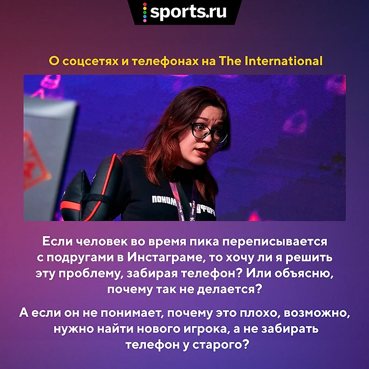 Правило насчет телефонов и соцсетей я вообще не понимаю. Что такое TI? Это твое время сиять. В том числе – в медиа. Мне кажется странным удалять соцсети в этот момент. Игроки Spirit ничего не удаляли, фотографии постили – и что? Это им как-то помешало выиграть TI?