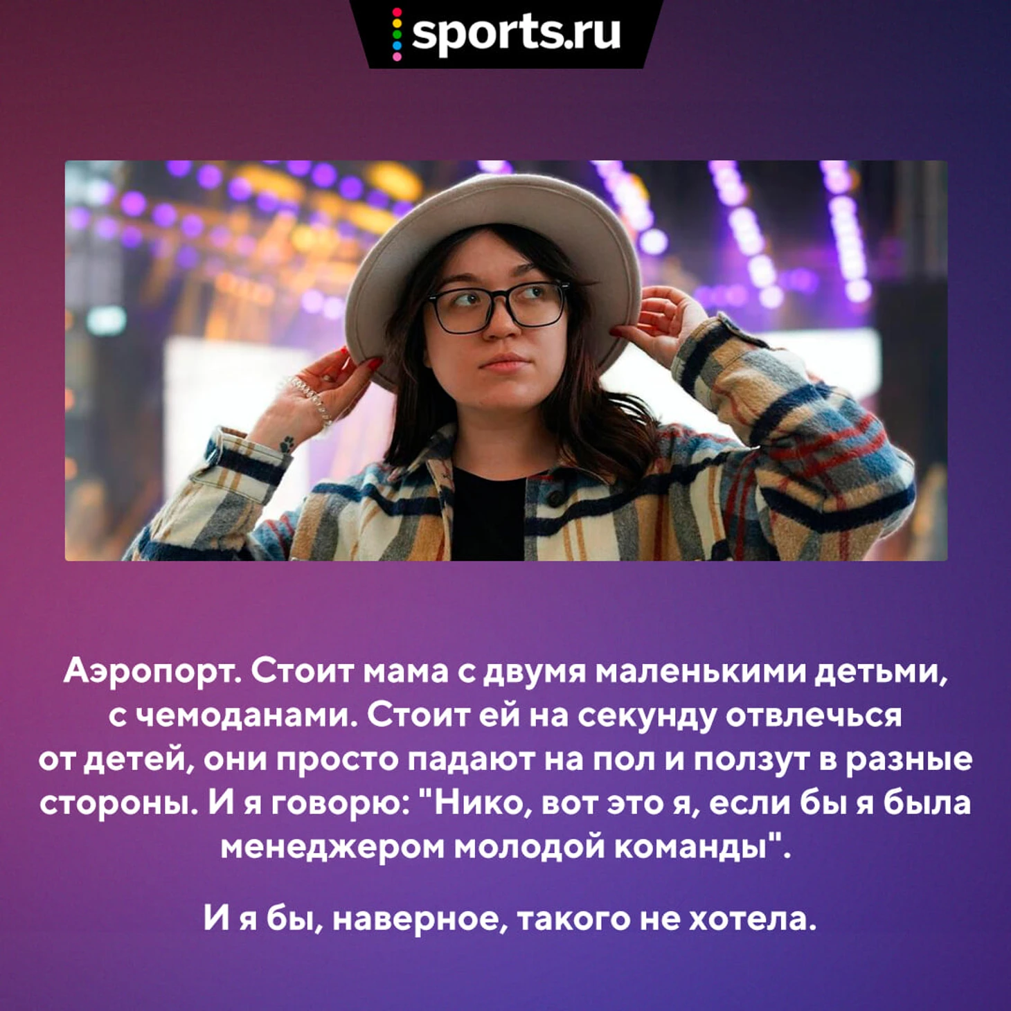 Мы эту тему обсуждали с Нико по дороге в аэропорт, и там застали следующую картину. Стоит мама с двумя маленькими детьми, с чемоданами. Она говорит по телефону. Стоит ей на секунду отвлечься от детей, они просто падают на пол и начинают ползти в разные стороны. И я говорю: «Нико, вот это я, если бы я была менеджером молодой команды». И я бы, наверное, такого не хотела. Не хотела бы быть менеджером-мамочкой, которая убирает тарелки, заправляет кровати и так далее.