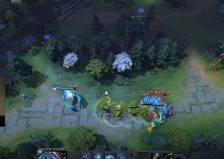 Spirit не растерялась и решила агрессивнее сыграть на боте. У Миры был шанс подцепить Аме, но китайца спас поворот в другую сторону от дерева. После этого чуть не подставился Мипошка – Аме вышел из невидимости в опасной близости от Виверны.