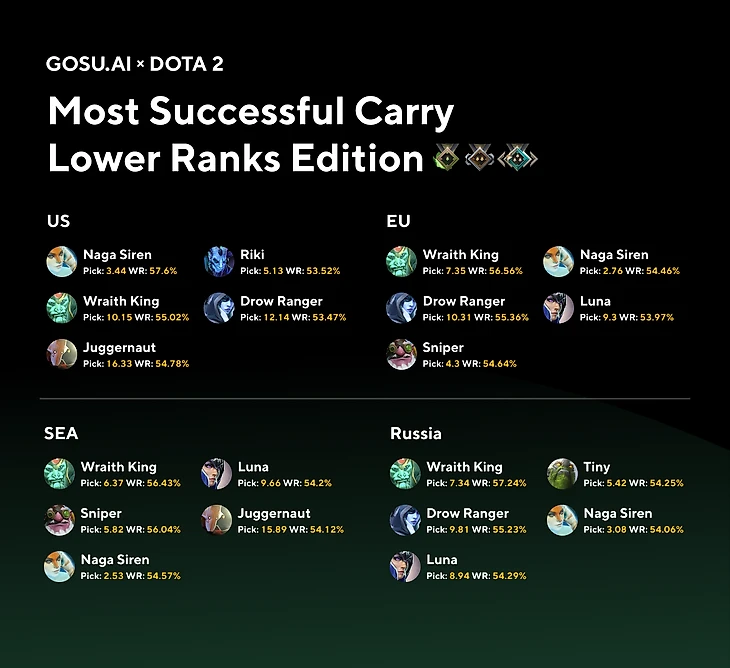 Привет! Сегодня мы хотим показать вам статистику керри героев с наиболее высоким винрейтом на низких рангах. Практически во всех регионах Wraith King занимает лидирующую позицию имея при этом довольно высокий пик-рейт. Также неожиданно и приятно видеть Naga Siren в этом топе героев, так как этот персонаж требует неплохого как микро так и макро контроля.