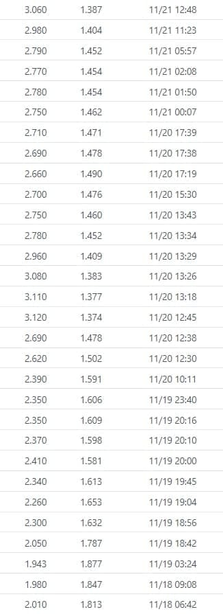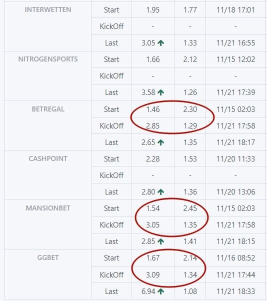 Но это еще не все странности, связанные с этой серией. Телеграм-канал «Кладовка горе-каппера» выложил скриншот с зависимостью коэффициентов на матч от времени. И да, кэф на победу NoMarci стремительно снижался с вечера 19 ноября и до начала матча. Возможная причина – кто-то ставил крупные деньги на команду Соннейко (картинка кликабельная):