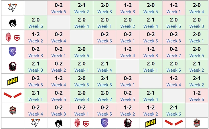 8 команд сыграли между собой по круговой системе (Round-robin). Каждая команда отыграла с каждым соперником одну bo3-серию. Всего 6 игровых недель.