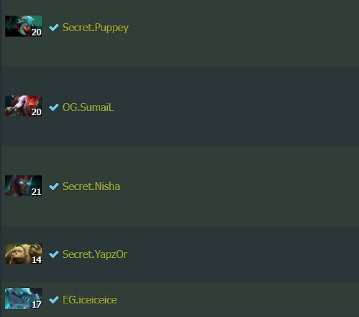 Puppey – пятерка Secret, но не на этой карте. На этой карте его Вивер максил Geminate Attack вместо The Swarm:
