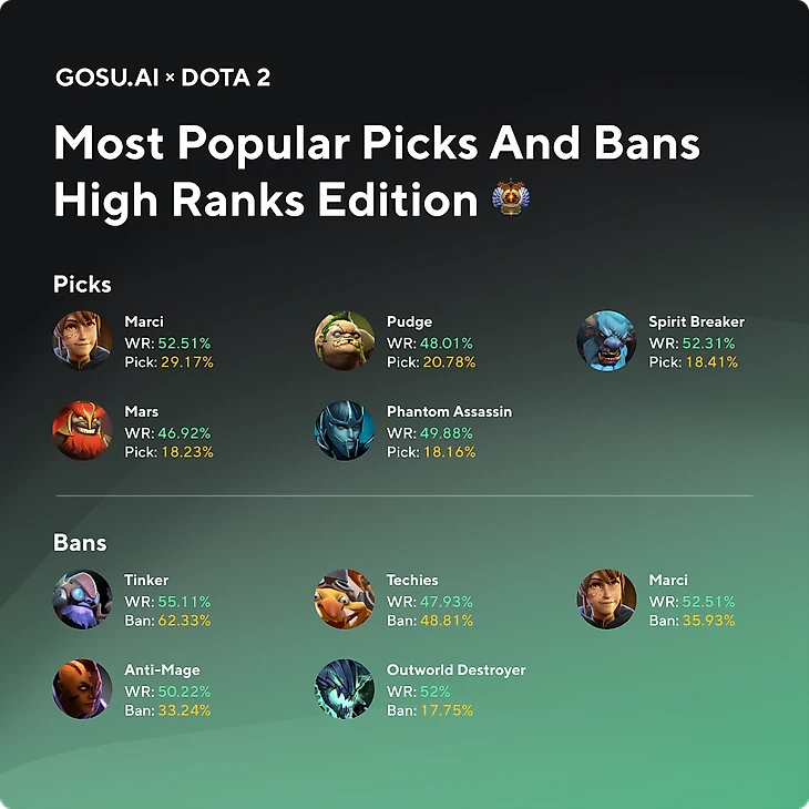 Привет! Сегодня мы хотим показать вам наиболее популярных героев в доте за последнее время. Данная статистика бралась преимущественно по высоким рангам. Из банов практически не вылезают такие герои как Tinker и Techies. Очевидно, что в следующем патче эти два персонажа подвергнутся значительным изменениям. Что касается пик-рейта, то Pudge не удалось пока что сместить Marci с первого места.