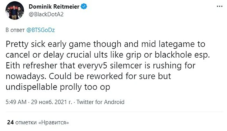 «Ульт вполне неплох в ранней игре и в середине поздней против больших кнопок вроде Fiend’s Grip или Black Hole, особенно с Рефрешером, который сейчас рашат все сайленсеры-пятерки. Наверняка можно переработать, но делать неразвеиваемым, вероятно, будет слишком сильно».