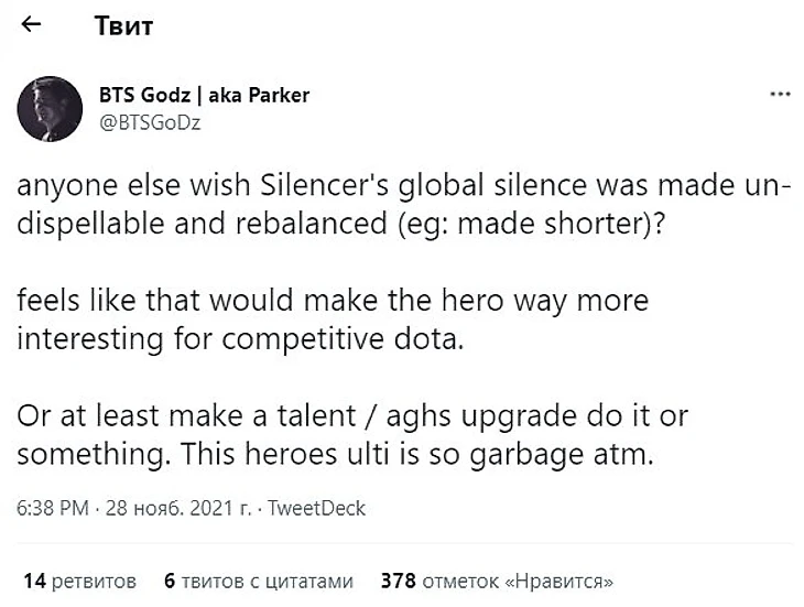 «А кто-нибудь еще хочет, чтобы Global Silence Сайленсера сделали неразвеиваемым и перебалансировали (например, сделали короче)? Кажется, что это сделает героя более интересным для соревновательной Доты. Или, по крайней мере, сделать талант/улучшение аганима или что-то в этом роде. Ульт у этого героя сейчас такой мусор».