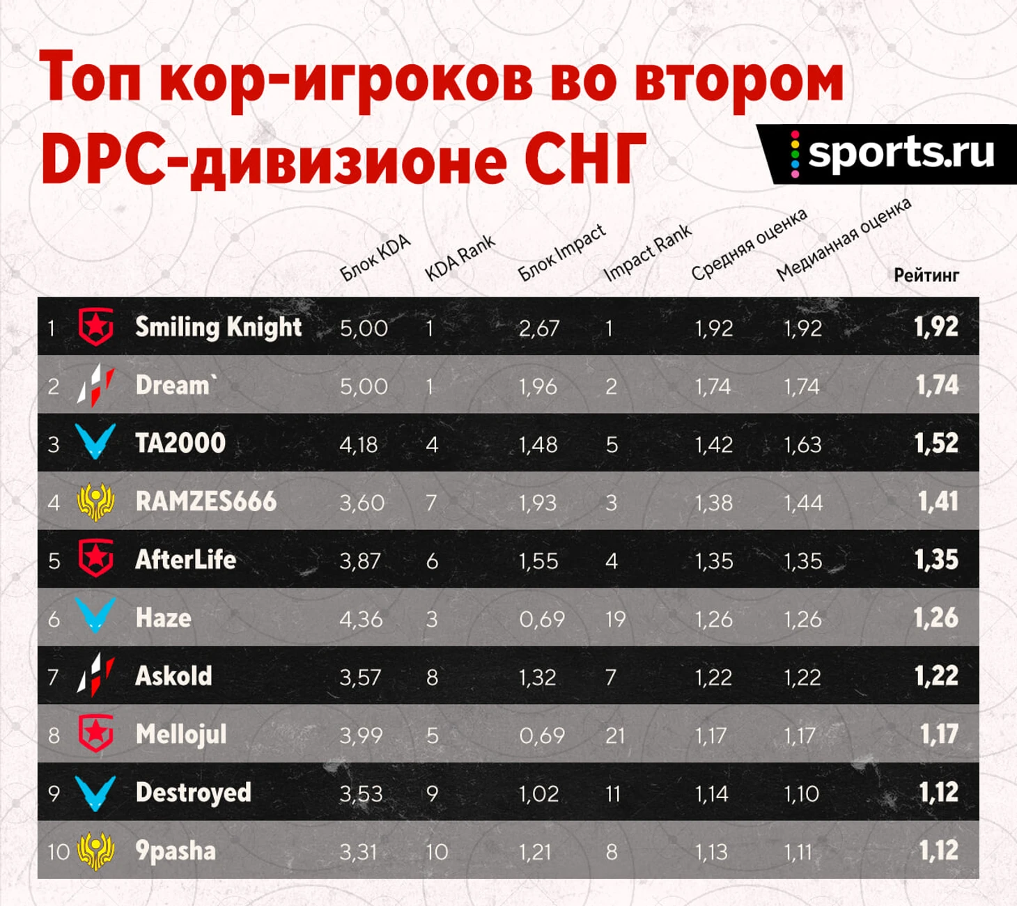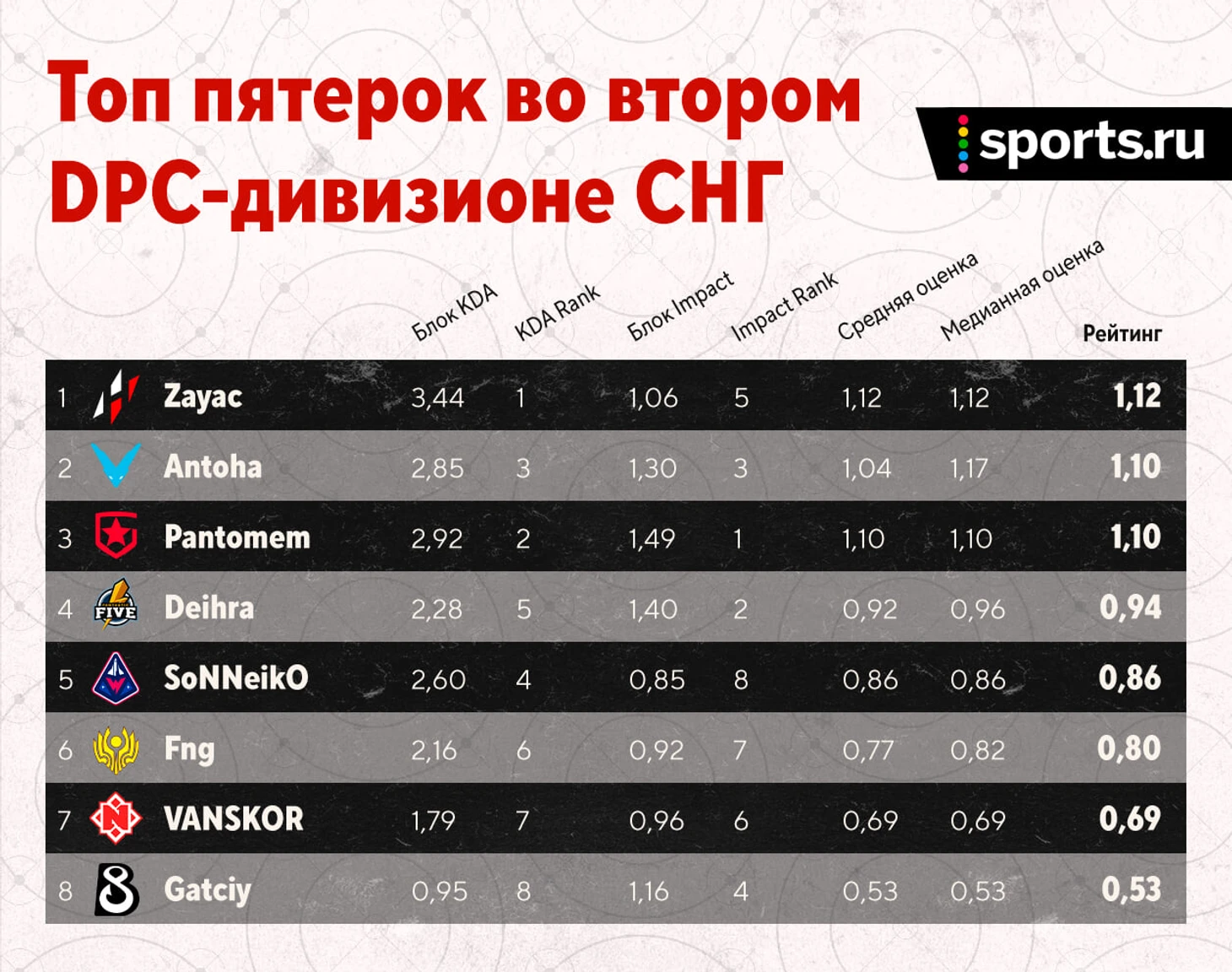 ★ У всего состава Gambit безумная статистика. B8 не оказала никакого сопротивления в первом туре. Не будем делать далеко идущих выводов, но отметим: только Pantomem не вошел в топ-10. При этом у саппорта Gambit очень достойный индекс для пятерки и весьма неплохое 15-е место в общей таблице. Команда Ахиллеса забрала 6 из 8 первых строчек в нашем рейтинге и наглядно показала, что ее цель – уверенное повышение в классе.