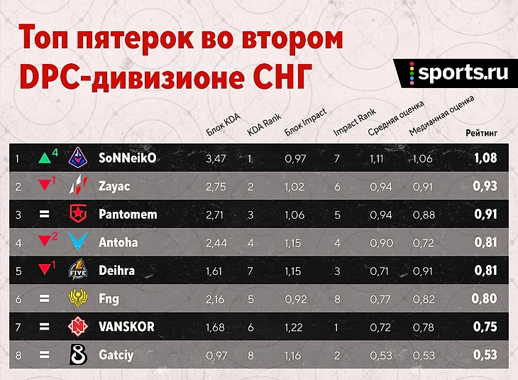 ★ Преображение тура – Winstrike. После ужасного матча против Гидры состав Соннейко уверенно обыграл F5. Неделю назад все, кроме капитана, шли где-то в районе последних мест. Теперь у Winstrike блестящие позиции в топе саппортов и просто хорошие – в списке кор-игроков. Оцените рывок по показателям: