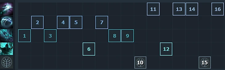 Выбор есть только на десятом уровне – я предпочитаю силу. В остальном мы добираем урон, перезарядку ульты и три атаки на прок проклятья.