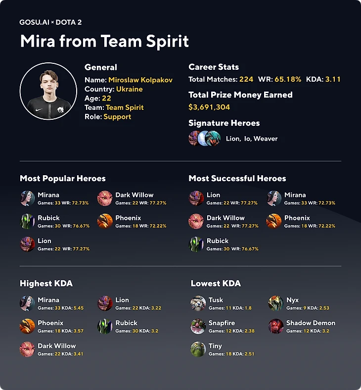 Привет! Сегодня мы хотим показать вам статистику компетитив матчей игрока команды Team Spirit - Mira. Удивительно видеть, когда герои с большим количеством игр также имеет и большой вин-рейт.  Надеемся этому игроку удастся воплотить свои планы и он все таки купит два завода — по производству хлеба и батончиков Twix.