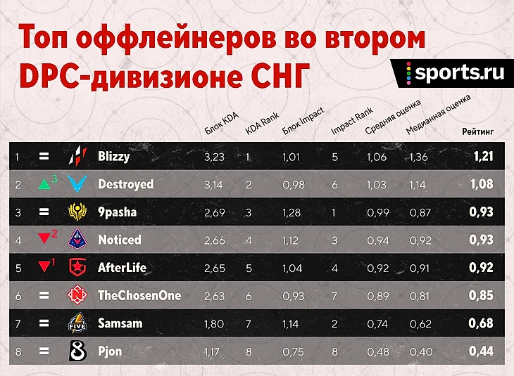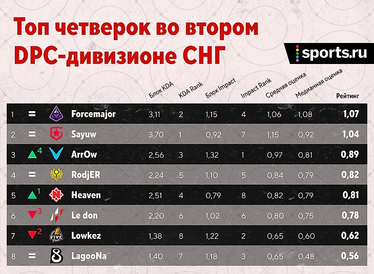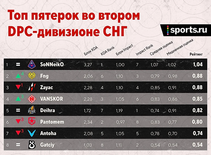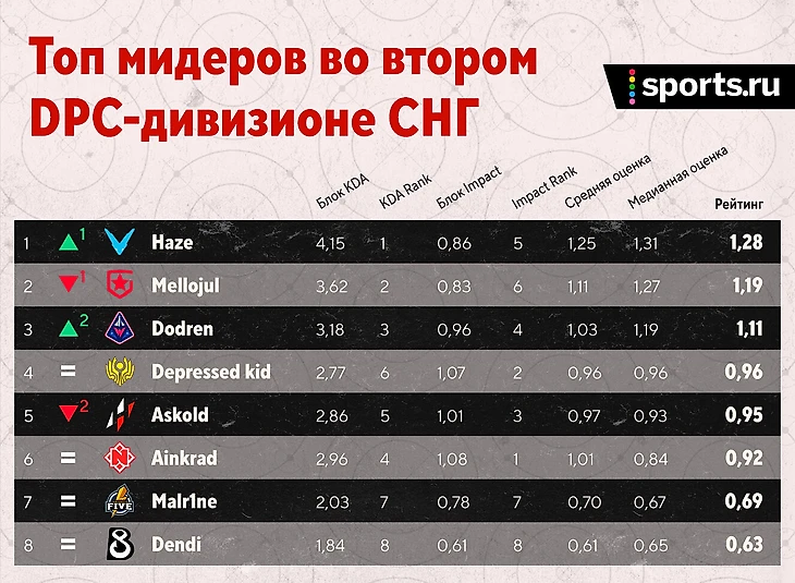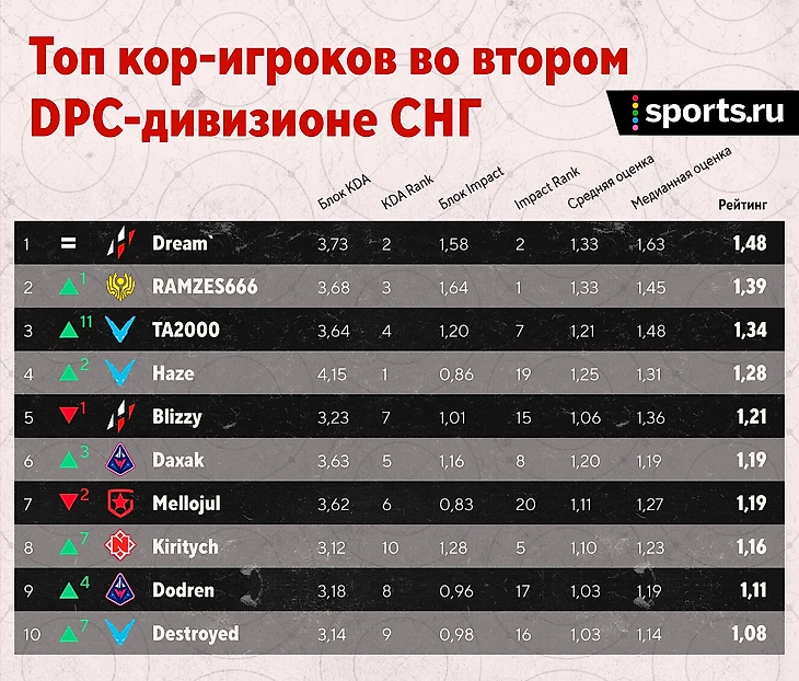 Правда, вопросы есть далеко не по всем игрокам. Mellojul и Sayuw играют отлично. Первый остается в семерке лучших в дивизионе. Второй удерживает место в топ-3 саппортов и всего на 0,04 отстает от общей 10-й строчки.
