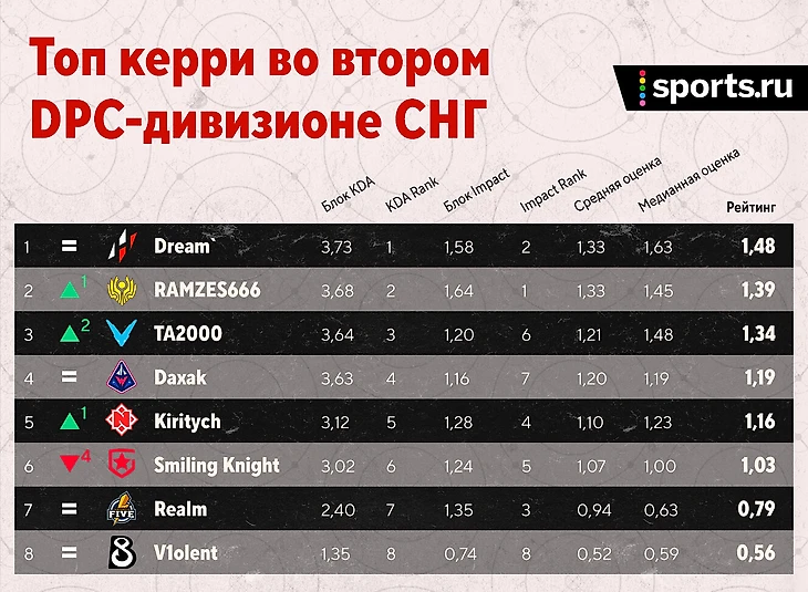 Зависимость от керри очевидна. Ramzes666 – единственный игрок CIS Rejects в топ-10 лучших. У следующего за ним Депрессед Кида рейтинг почти в 1,5 раза ниже и аж 15-е место в общем топе. В целом весь остальной состав CR играет далеко не на флагманском уровне. В топ-2 на своей позиции входит только Fng (и то с большим отставанием от лидера). Места в общей таблице говорят сами за себя: