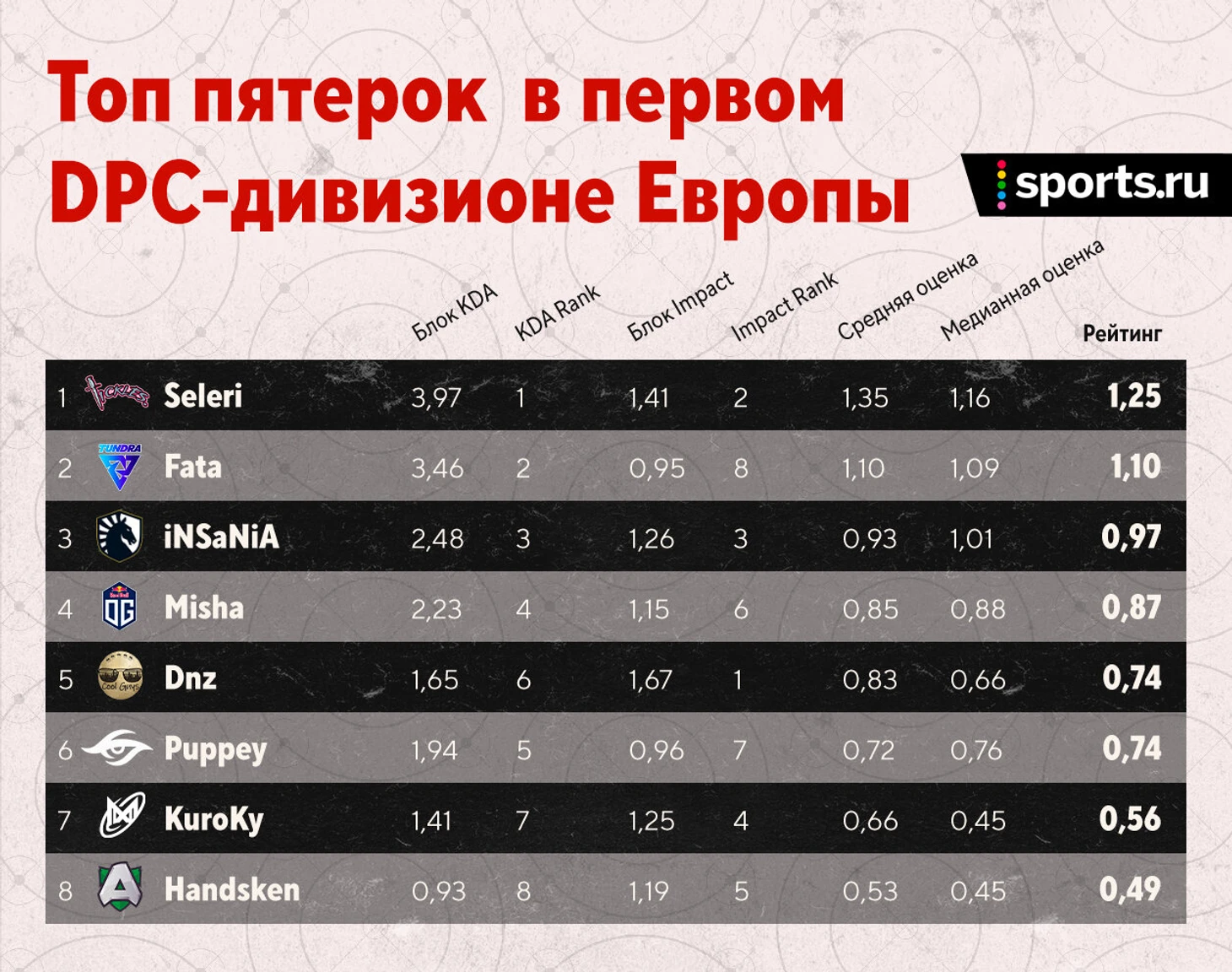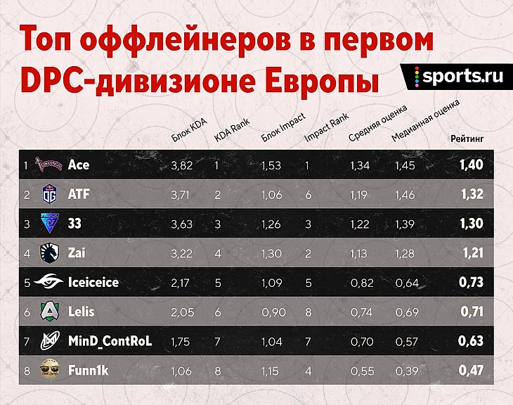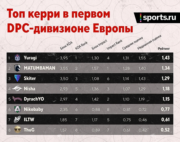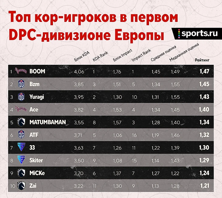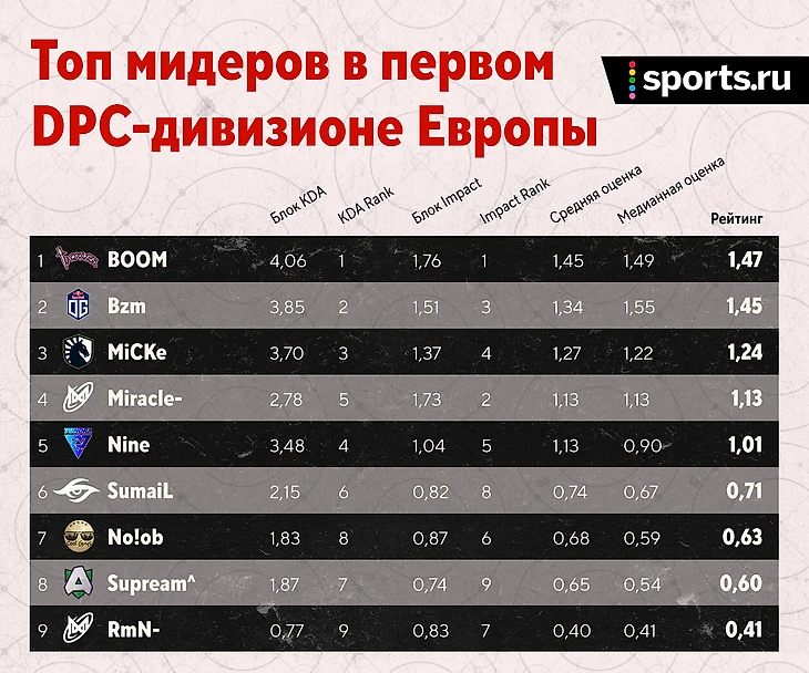 Кратко по игрокам: неплохо, но не более. Да, пришел в себя Матумба – единственный игрок Liquid в топ-10. Правда, совсем рядом MiCKe – на 11-й строчке. Не так уж плох и Zai с 13-й позицией. Благо, его отставание 10-го места всего 0,04. С саппортами сложнее: Boxi – 19-й, Insania – 21-й. Учитывая, что в таблице 41 строчка, можно смело сказать – сапы у Liquid средние.