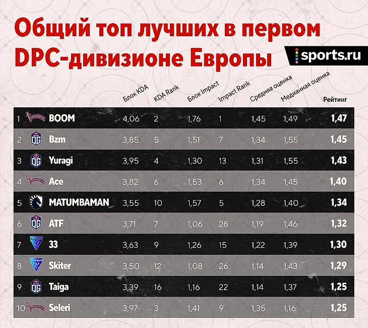 ★ Начнем с OG. У команды Чуваша все прекрасно: 2-е место в таблице и 4 игрока в топ-10 нашего рейтинга. Цифры говорят сами за себя – проседает только капитан. Misha с 23-й строчкой в общем списке пока смотрится не очень. Taiga, Bzm и Yuragi в полнейшем порядке. ATF тоже идет неплохо.
