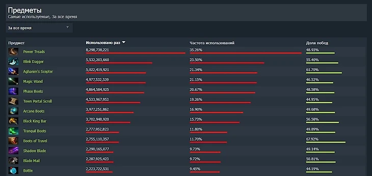 В своем нынешнем виде это в принципе самый проблемный предмет Доты. Вот статистика самых используемых предметов в игре за всю ее историю:
