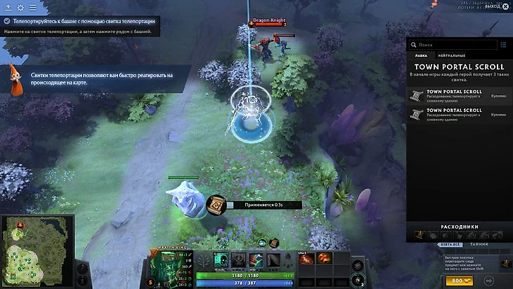 1.4 Телепортация или то, чего нам так не хватает в жизни. Сразу же покупаю в лавке и пробую перемещаться с помощью заветного свитка, вроде бы несложно. Далее мне нужно не дать совершить телепортацию моему противнику, используя одну из моих способностей. Таким образом, узнаю, что если способность наносит оглушение, значит телепортация прерывается. Легко и просто, оценка: 5 из 5, идём дальше.
