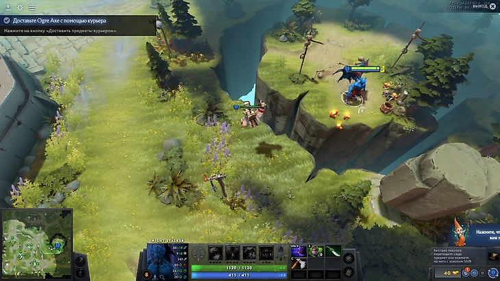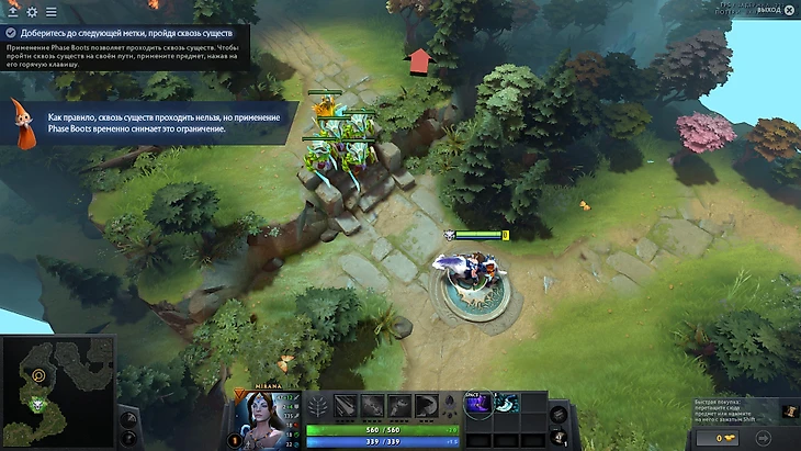 1.3 Идём прямиком к этапу "Перемещение". Весь этап построен на том, что мне объясняют как двигаться по карте. Простыми кликами или же с помощью предметов, способствующих движению, таких как Phase Boots, Blink Dagger, Force Staff. Узнаю, что есть руна ускорения, которая также помогает увеличить скорость. Всё это время я играю на герое Mirana и тут мне решают рассказать про одну из ее способностей, благодаря которой я также могу быстрее продвинуться вперед, и конечно же, предлагают ее опробовать. Дойдя до конечной точки испытаний, перепробовав все варианты движения, заканчиваю сценарий.