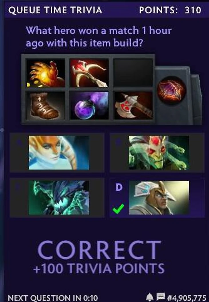 Вопрос: Какой герой выиграл матч 1 час назад с этой сборкой?