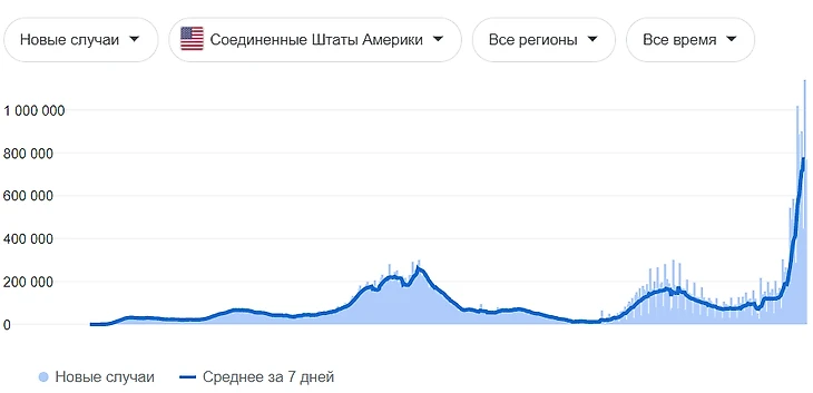 Вы точно слышали про «Омикрон» и успели хоть раз приплести к нему Оксимирона, но вряд ли осознавали масштаб пандемии на данный момент. Взгляните на статистику новых случаев в США за все время и найдите вспышку «Омикрона»: