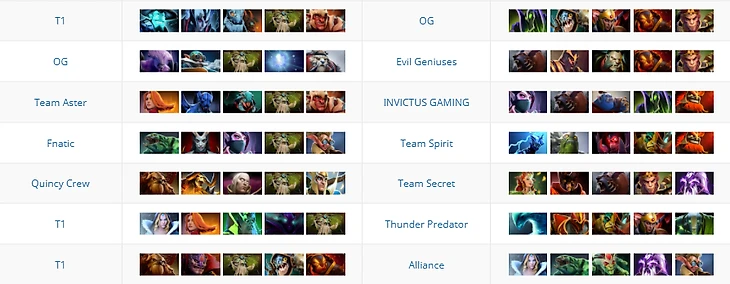 Начнем наблюдение с TI10 – турнира, где формировалась текущая мета. В Бухаресте на постоянной основе Трента брали две команды – Quincy Crew (но они уже в групповом этапе отказались от него) и T1 (4 игры).