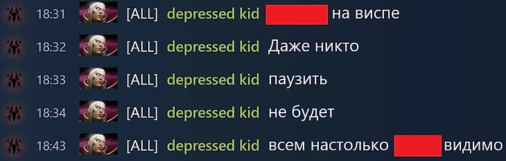 Не так давно Депрессед попался против Сэйва. Глеб был очень удивлен, что команда Виталия проигрывала аж 13к золота к 23-й минуте. Он вспомнил, что еще неделю назад Сэйв играл по 100-120 пабов в неделю, а сейчас всего-то 30. «Наверное, у него плохое настроение или пропало желание играть в Доту, я должен ему помочь», – подумал Депрессед. Когда его команда била Т4, он встал под фонтан противника, купил Армлет на Квопе, выкупился, сагрил на на себя две Т4, Армлетом просадил свое ХП и подарил еще один фраг противникам, чтобы у них появился шанс на камбэк. А потом написал это, чтобы еще сильнее зарядить команду напротив энергией победы: