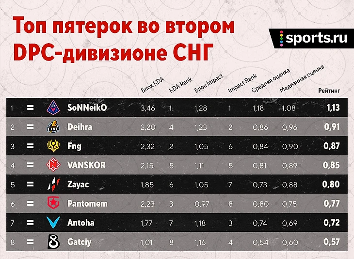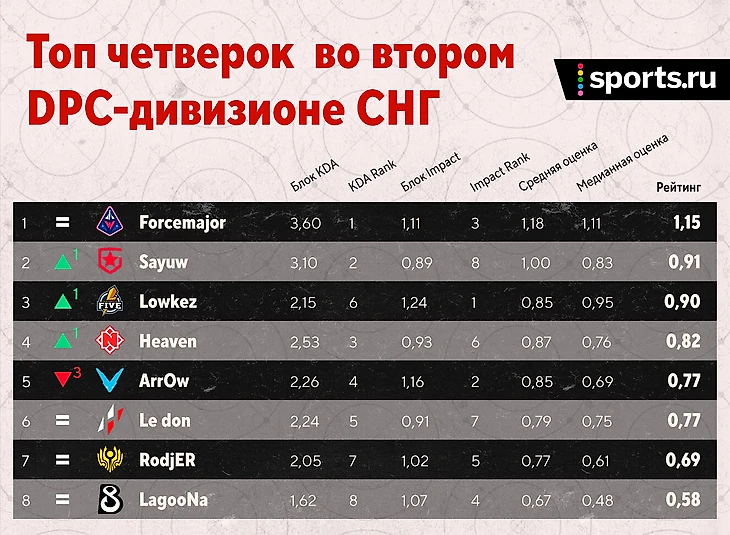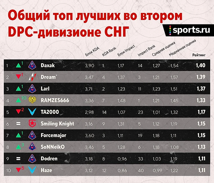 ● Dream` до последнего тащил Гидру, но его усилий не хватило. На протяжении всего сезона экс-керри Gambit ни разу не опустился ниже 2-й строчки. 3 раза по итогам тура Кыялбек занимал 1-е место в дивизионе. Но Hydra проиграла все решающие матчи за выход в элиту и осталась во второй лиге. К сожалению для Дрима, это закономерный итог. Из его тиммейтов только Zayac занял позицию выше 6-й в таблицах по ролям. Также Бакыт вошел в десятку лучших саппортов. Уровень остальных в лучшем случае средний: