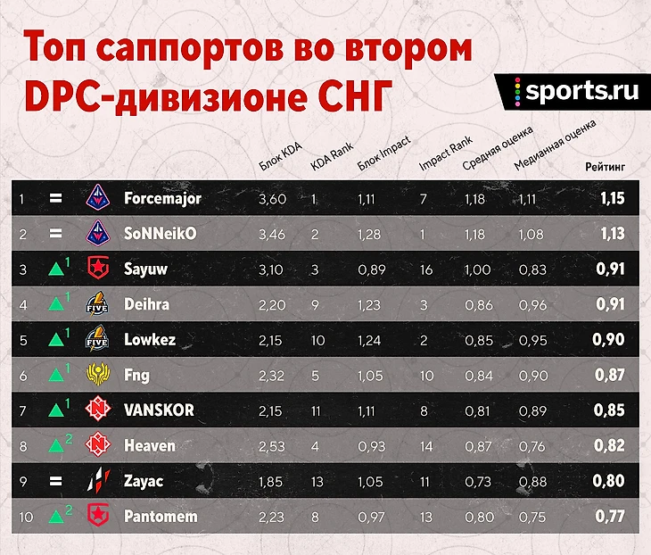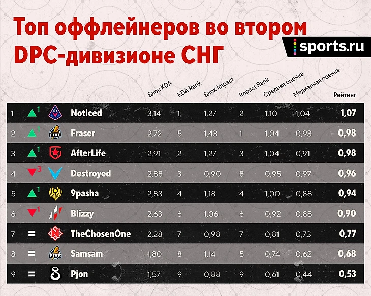 У остальных картина печальнее. Fng сыграл нормально, не более: 6-я строчка из 16 в списке саппортов. Паша отыграл плюс-минус средне: 5-я позиция среди 9 троек и 18-я среди всех 42 игроков. Слабое место CIS Rejects – RodjER. Владимир замкнул тройку худших саппортов лиги и стал 7-м с конца в общей таблице. Именно форма экс-четверки VP вызывает наибольшие опасения перед стартом следующего сезона.