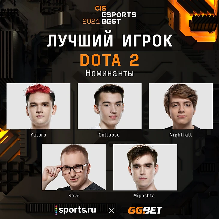 Шорт-лист номинации «Лучший игрок Dota 2» на CIS Esports Best. Здесь Nightfall, Save и три игрока Spirit