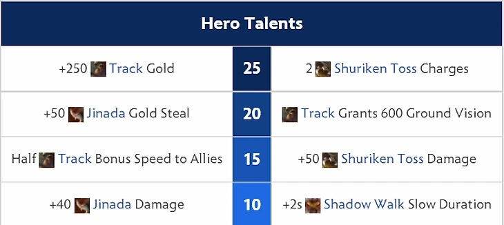 Талант 10-го уровня на Jinada берем на 11-м, потому что сам по себе апргейд скилла важнее таланта. На пятнадцатом берем урон Сюрикена, на двадцатом – дополнительное золото с Jinada.
