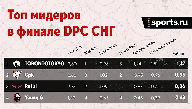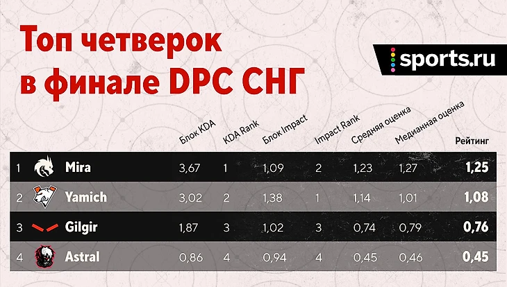 HellRaisers же развеяли сомнения относительно случайности попадания в топ-4. Re1bl cнова показал, кто лучший в HR. Ему всего 0,09 не хватило до попадания в топ-10. При этом Максим как минимум на 0,10 обогнал всех тиммейтов. Радует прогресс саппортов: в DPC-лиге Gilgir и Malady заметно отстали от своих коров. Теперь же они финишировали сразу за Рейблом. У четверки рейтинг на 0,10 ниже, а у пятерки – на 0,14.