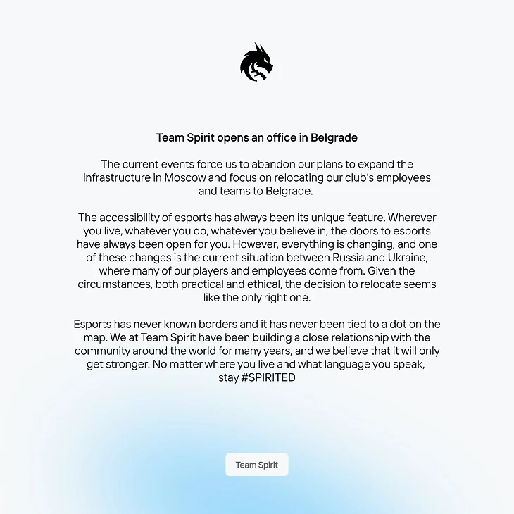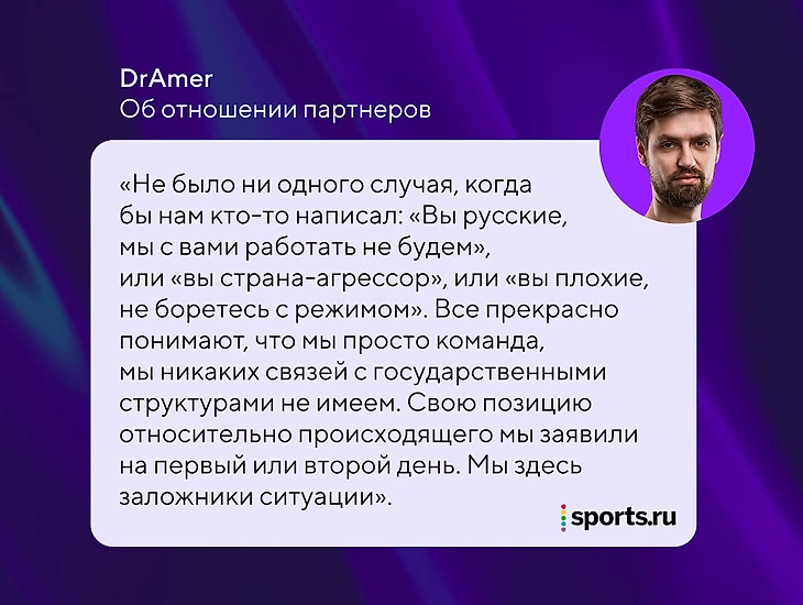 – На самом деле, это главная причина, почему я захотел поговорить об этом еще раз. Это пост Маши Гуниной про мимикрирование под сербскую команду. Когда я говорил об этом, я имел в виду, что именно мимикрировать смысла нет. Нет смысла приезжать и говорить: «Ребята, мы теперь сербы». Позиция Спиритов абсолютно адекватная и правильная. Они заявляют, что мы российская команда. У нас буткемп в Сербии, потому что там сейчас лучше. Но мы не сербская организация. [Интервью записано до публикации анонса Team Spirit]. И это правильно. Я имел в виду, что не надо пытаться делать вид, что у тебя нет никаких связей с Россией. Это бесполезно. Все и так понимают, кто они и откуда.