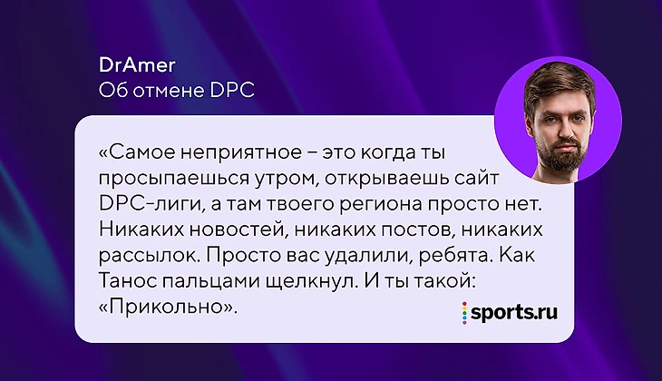 Valve тоже могли сделать что-то подобное. Ну или хотя бы не принимать решения молча. Самое неприятное – это когда ты просыпаешься утром, открываешь сайт DPC-лиги, а там твоего региона просто нет. Никаких новостей, никаких постов, никаких рассылок. Просто вас удалили, ребята. Как Танос пальцами щелкнул. И ты такой: «Прикольно». А люди вложили в команды деньги, сделали бандлы, многие наняли селебрити. Можно же было хотя бы бандлы добавить? Турнира нет, но фанаты-то есть. Ведь сейчас пауза закончится и, возможно, каких-то команд вообще не будет, потому что денег нет.
