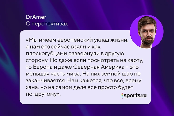 И несмотря на всеобщие опасения, что здесь все загнется и ничего не останется, я в это не верю. Это неправда. Останется. Выживет. Когда говорят, что «выживет, но уровень игры будет низкий и непрофессиональный», я вспоминаю советский хоккей. Когда советские хоккеисты до 70-го или 71 года были совершенно отрезаны от мира и ни с кем не играли, кроме как внутри. А приехали – и все получилось неплохо. Или китайская сцена, где китайцы в Доту играют исключительно с китайцами, но уровень игры у них отличный. И при этом это не топ-1 или топ-2 дисциплина в этой стране, не национальная идея.