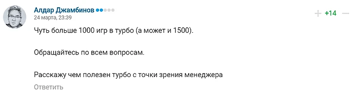 Турбо действительно помогает в менеджменте. Во-первых, это экономия, а во-вторых, после поражения в этом режиме не так сильно горишь. Кроме того, Турбо приучает тебя постоянно находиться в тонусе, и это влияет на меня. На буткемпе, где я работал с командами, я даже думал, что у меня время ускорялось. Рабочие дни пролетали один за другим, я постоянно был чем-то занят.