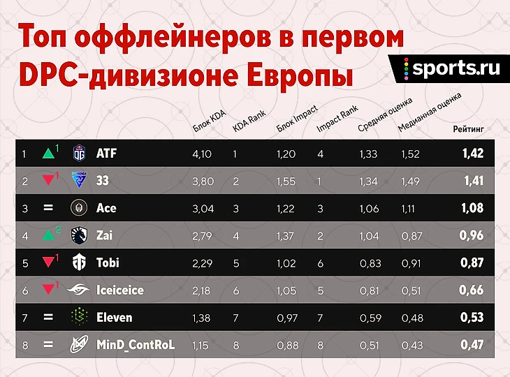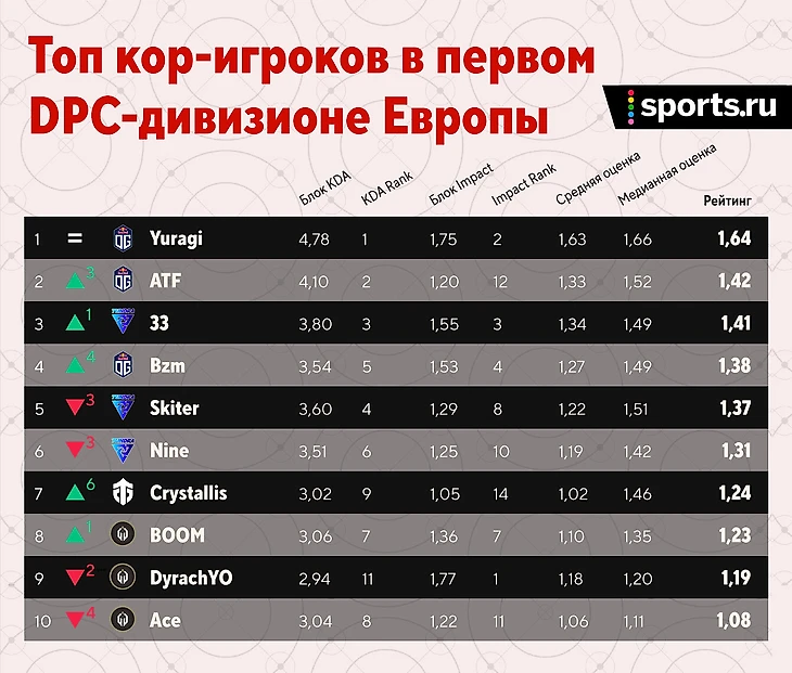 ● Dyrachyo – красавчик. Идет в десятке лучших и отыгрывает на второй рейтинг в команде. Пока Антон опережает свой предыдущий индекс по итогам DPC-лиги на 0,08.