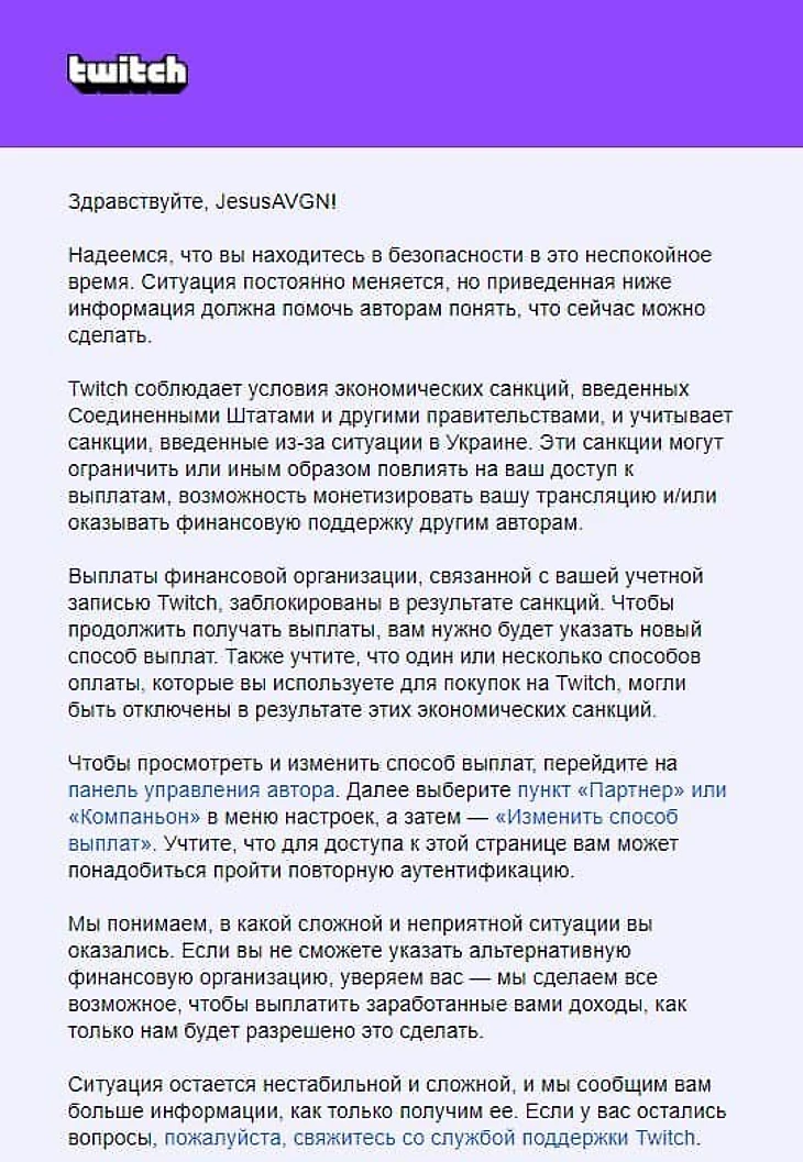 Чуть позже Twitch в официальных письмах российским стримерам сообщил, что выплаты средств были отключены в связи с санкциями США. Стримеров не лишили полностью возможности выводить средства: россияне могут выбрать платежный инструмент для зачисления денег, который не попал под санкции. Об этом сообщил JesusAVGN 5 марта.