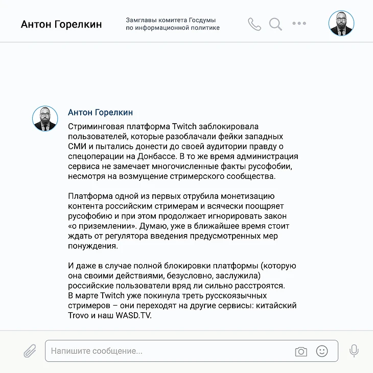Заявление депутата осталось без должного внимания, но спустя аж полтора месяца слуги народа снова вспомнили об угрозе со стороны стримингового сервиса. Замглавы комитета Госдумы по информационной политике Антон Горелкин 17 апреля высказался о работе Twitch в России.