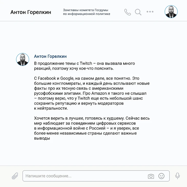 Примечательно, что спустя сутки, видимо получив фидбек на свой призыв заблокировать Twitch, Горелкин снова высказался в своем telegram-канале. В этот раз он уже был не так категоричен и заявил, что верит в Amazon (владелец Twitch) и что у компании есть шанс сохранить репутацию.