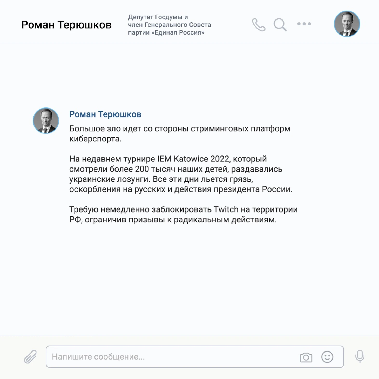 Если коротко – да, есть. Сейчас я вам покажу, откуда на российский киберспорт готовится нападение. Первый звоночек поступил 4 марта от Депутата Госдумы и члена Генерального Совета партии «Единая Россия» Романа Терюшкова. Он потребовал заблокировать Twitch в России из-за украинских лозунгов на IEM Katowice 2022.