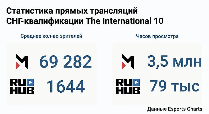 Подобную попытку от RuHub можно было наблюдать на трансляциях квалификаций последнего The International. По цифрам это был не провал, а провалище: средний онлайн на официальной трансляции СНГ-квалификации от Maincast – 69 282 человека, против неофициальной трансляции от RuHub с пиком в 1644 человека.