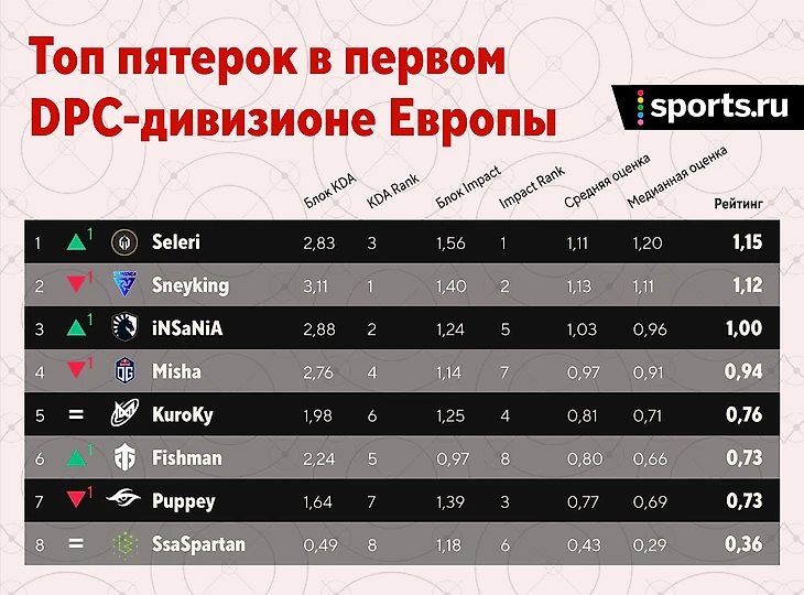 Также сильно настораживает регресс Айсайсайса и Пуппея. Рейтинг Дэрила упал на 0,12, а Клемента – на 0,17. Теперь сингапурец – 7-й с конца среди всех игроков, а эстонец – 11-й с конца. Точно ли осенние замены в Secret пошли команде на пользу?
