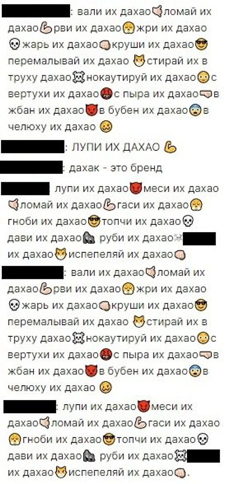 «лупи их дахао😈меси их дахао🤙🏻ломай их дахао💪🏻гаси их дахао😤гноби их дахао😎топчи их дахао💀 дави их дахао🦍 руби их дахао☠️##### их дахао😼испепеляй их дахао👊🏻».