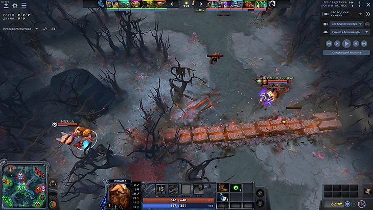 Команды расставляют варды в смоках, никаких драк не происходит. Куроки на личе ест крипа в миде, а Gh блочит союзных крипов для MC. Это значительно упрощает стояние на миде и в харде, что потом скажется к 10 минуте.