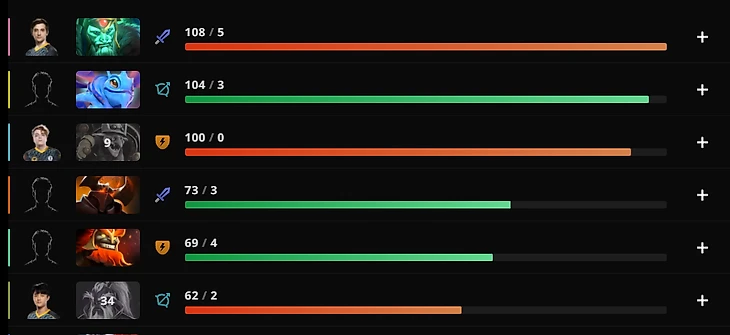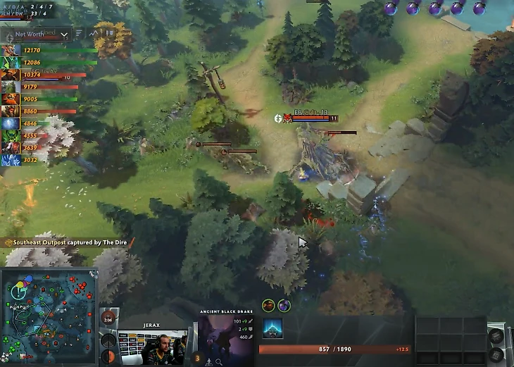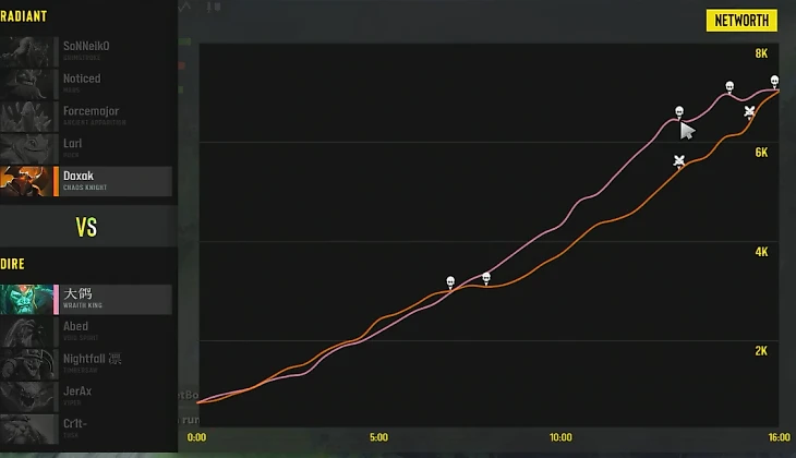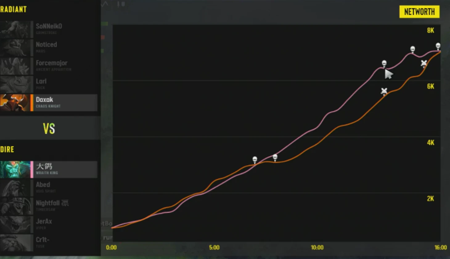 Ганг №3. Третий раз это было уже смешно: снова выход в чужой лес от BB, снова фраг на Артуре. А вот что совсем не вызывало улыбок у фанатов EG, так это графики сравнения двух керри. Wraith King обязан фармить больше (и он фармил!), но три смерти позволили Дахаку догнать ВК – критическая ситуация для американской команды.